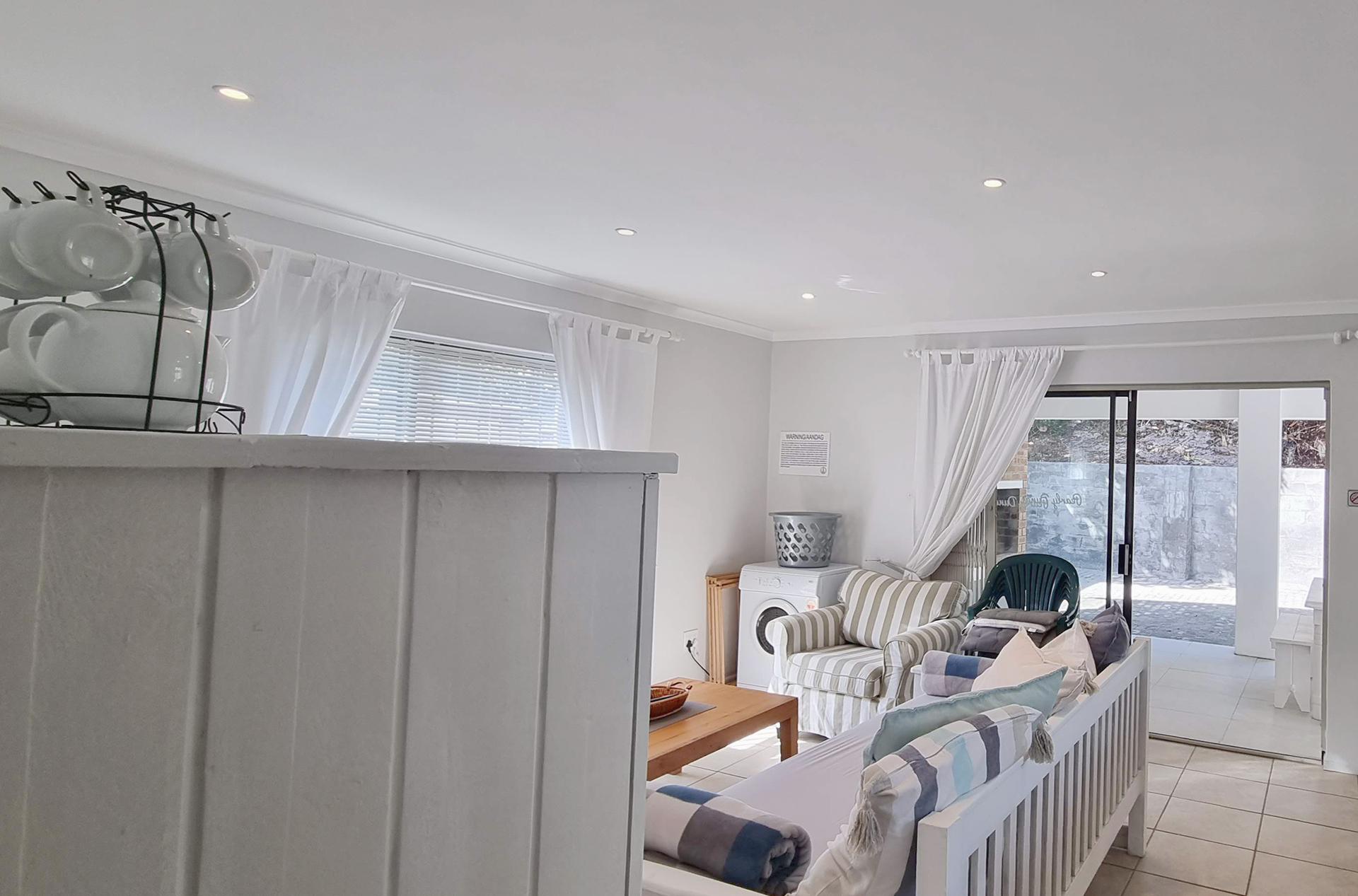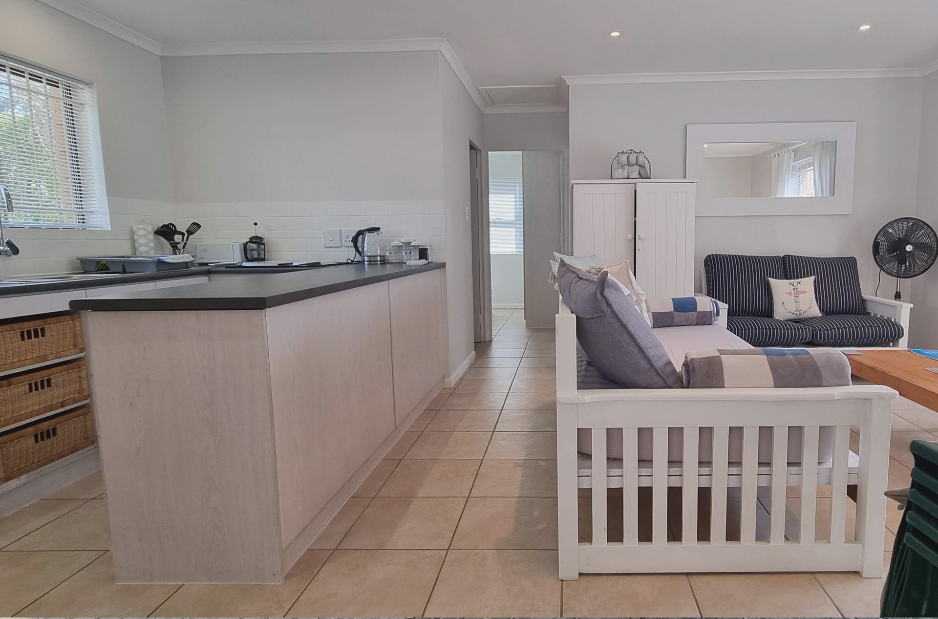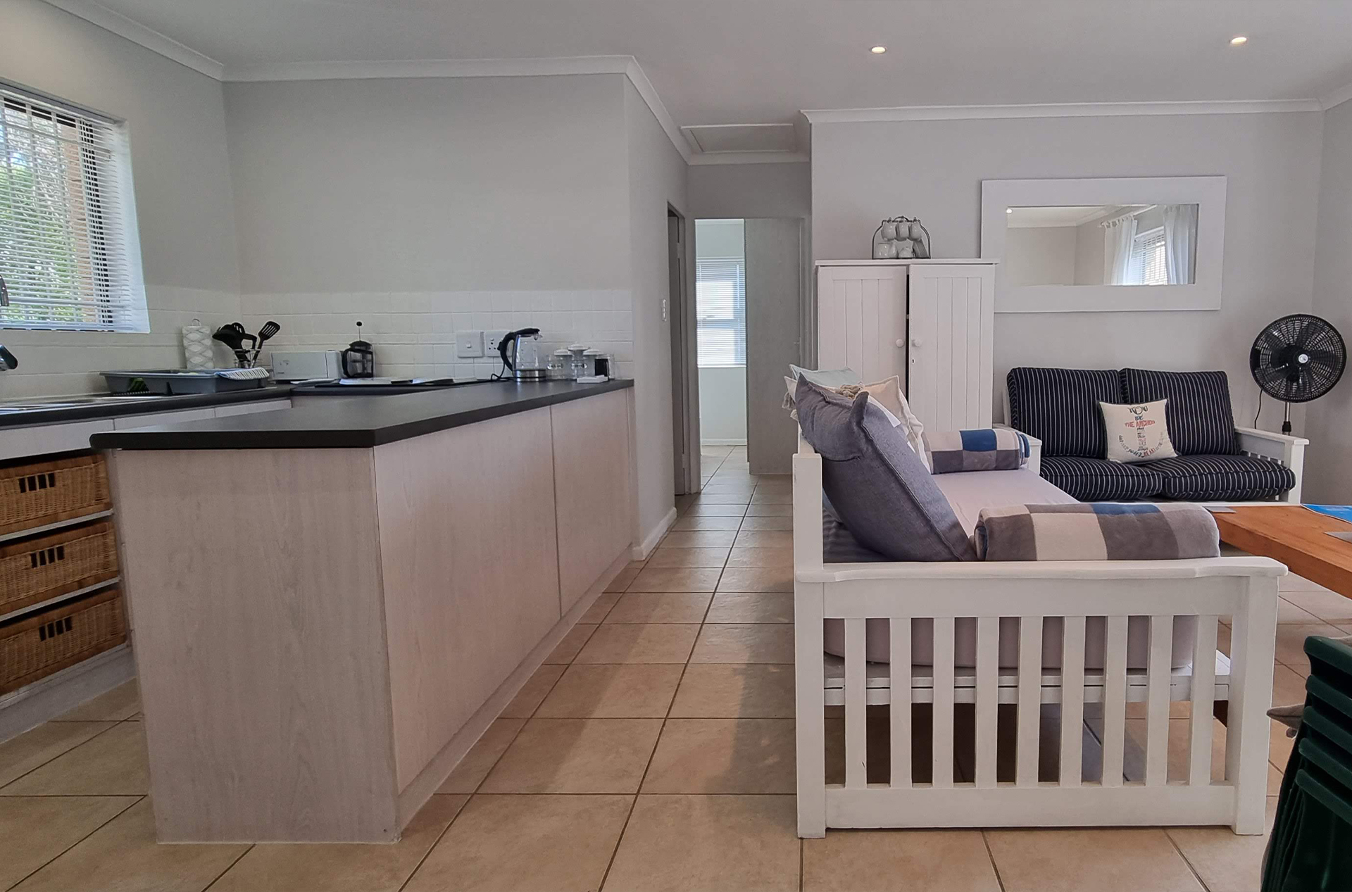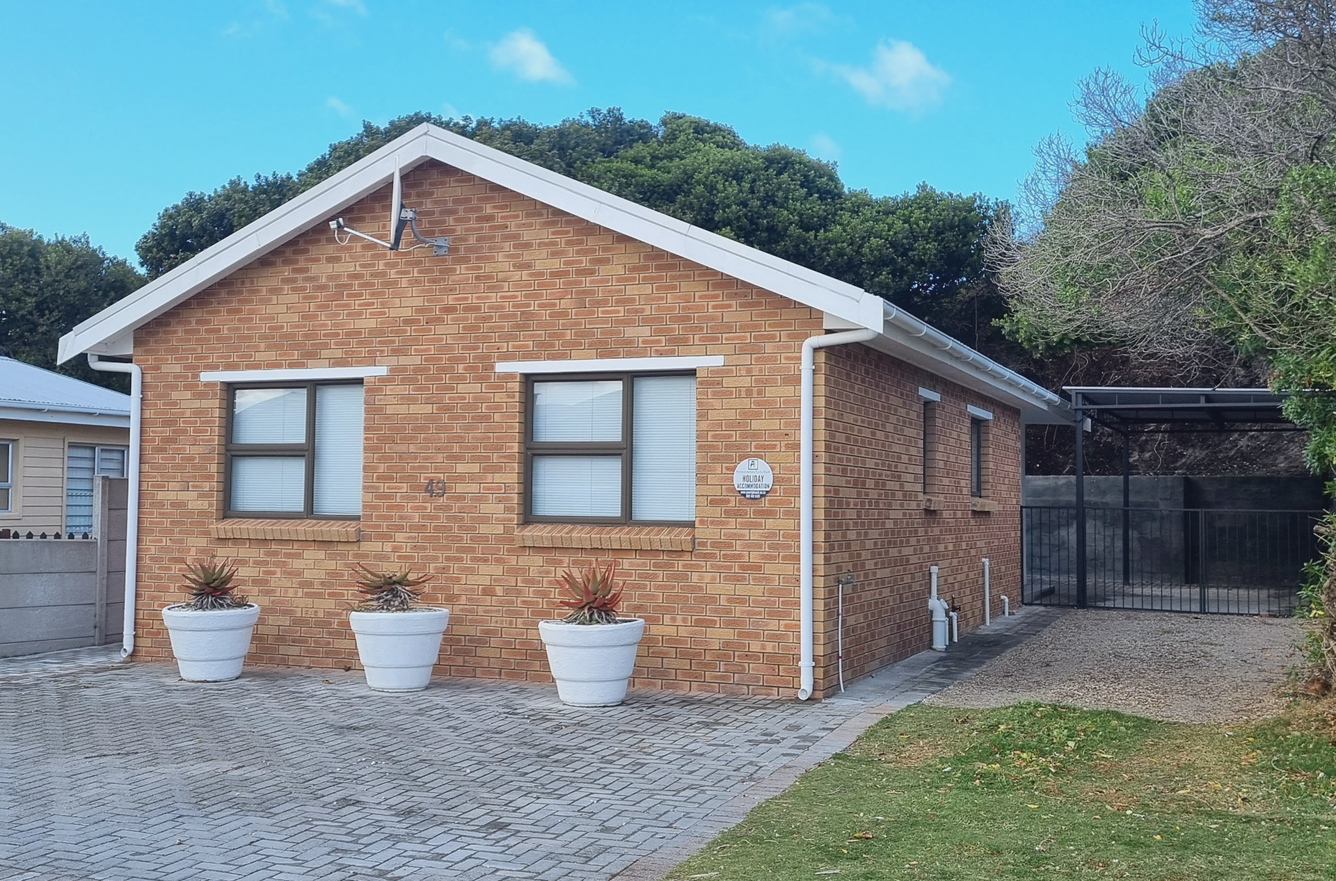 Escape to Pearly Dunes, a charming self-catering holiday home nestled within the secure Pearly Beach Resort. Just 220 meters from the beach, this inviting retreat is perfect for families of up to five guests seeking a peaceful seaside escape. This free-standing home features two bedrooms, one bathroom, and an open-plan kitchen and living area, making it ideal for a relaxing and comfortable stay. The fully equipped kitchen includes a washing machine and tumble dryer, ensuring convenience during your holiday. The living area is furnished with comfortable couches, a TV, and a sleeper couch, creating a cozy space to unwind after a day at the beach. Leading out from the living area is a covered patio with a built-in braai, perfect for enjoying outdoor meals with family and friends. The home also has a private enclosed yard, offering a safe and peaceful space for relaxation.